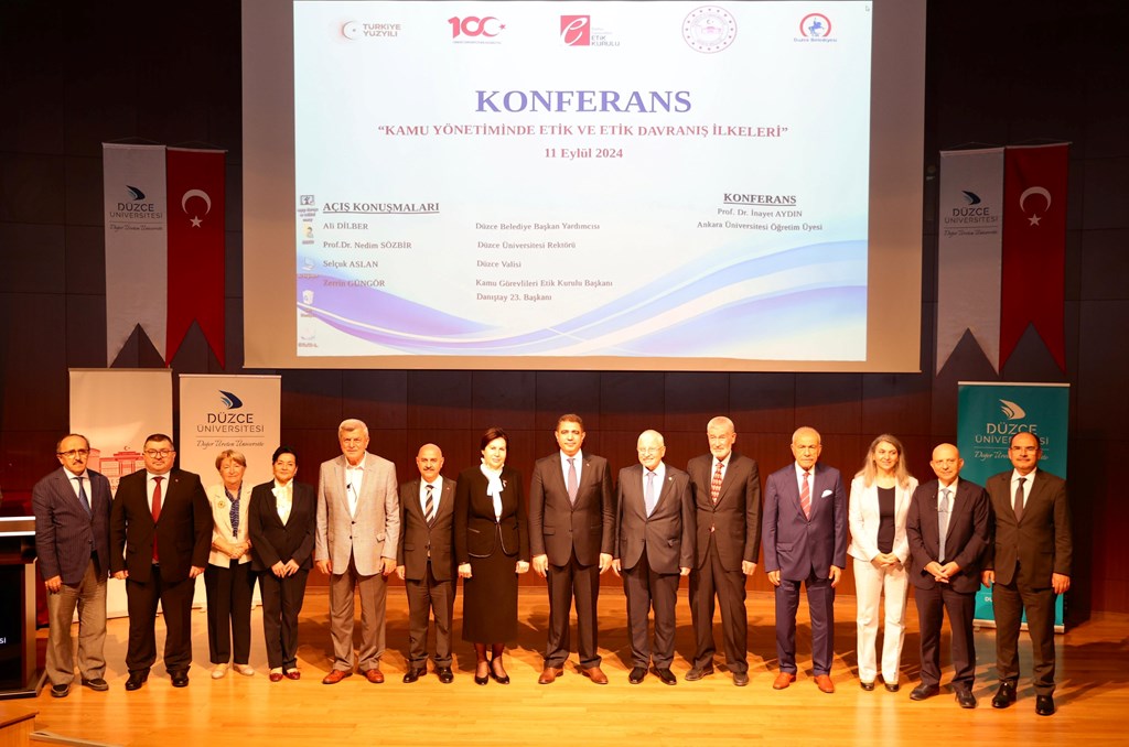 Kamu Görevlileri Etik Kurulu Başkanı ve Kurul Üyelerinin katılımı ile 2021 yılında başlattığımız il etik konferanslarının devamı olan ve Düzce Valiliği ve Düzce Belediye Başkanlığının ev sahipliğinde, Düzce Üniversitesinin katkılarıyla düzenlenen “Kamu Yönetiminde Etik ve Etik Davranış İlkeleri” konulu etik konferansı, 11 Eylül 2024 tarihinde Düzce il protokolü ile ilde görev yapan 550 kamu görevlisinin katılımıyla gerçekleştirildi. Düzce Belediye Başkan Vekili Sayın Ali DİLBER, Düzce Üniversitesi Rektörü Sayın Prof. Dr. Nedim SÖZBİR, Düzce Valisi Sayın Selçuk ASLAN ve Kurul Başkanımız Sayın Zerrin GÜNGÖR’ün açış konuşmaları sonrası Ankara Üniversitesi Öğretim Üyesi Sayın Prof. Dr. İnayet AYDIN’ın sunumu ile konferans tamamlandı.